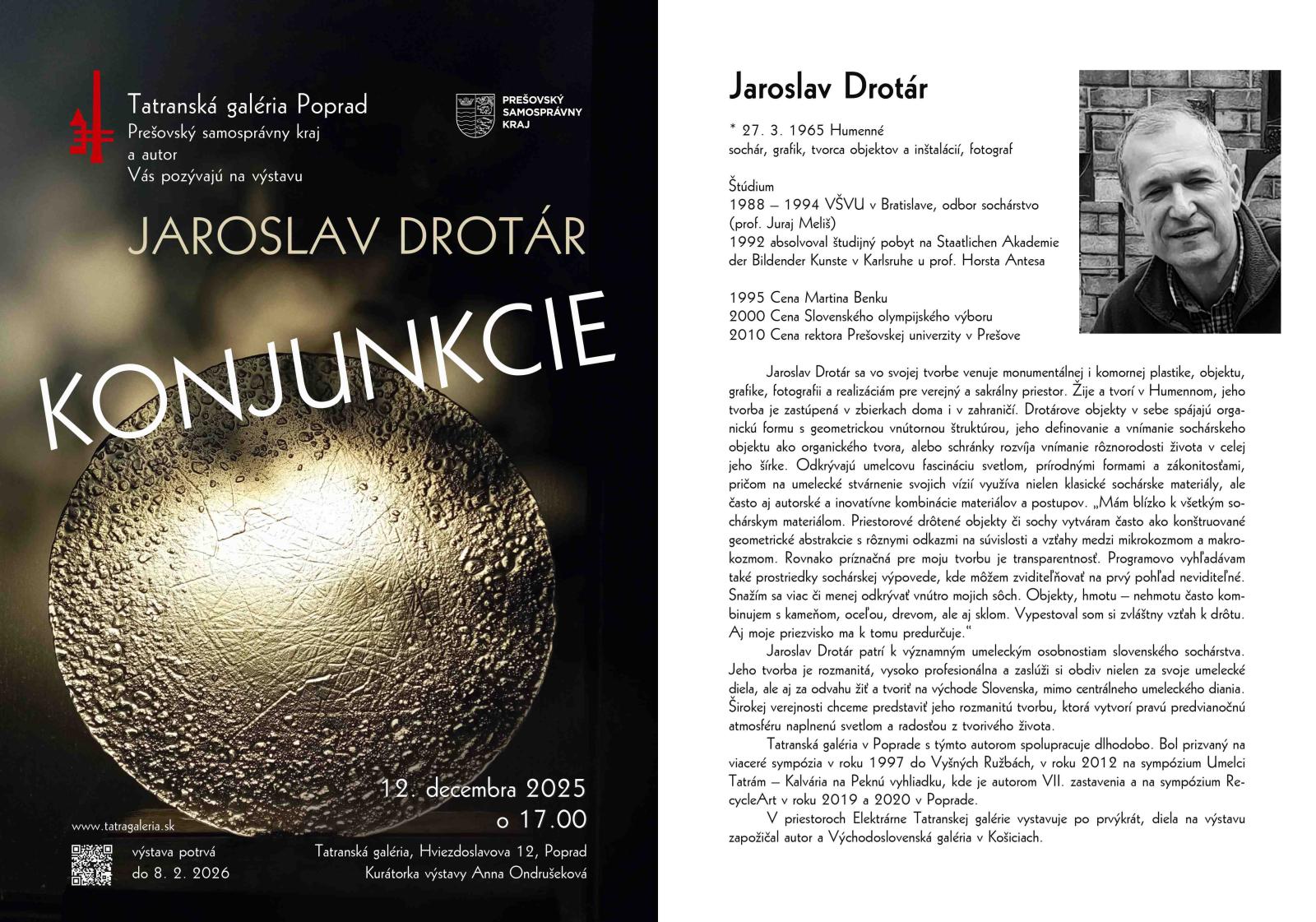 Jaroslav Drotár sa vo svojej tvorbe venuje monumentálnej i komornej plastike, objektu, grafike, fotografii a realizáciám pre verejný a sakrálny priestor. Žije a tvorí v Humennom, jeho tvorba je zastúpená v zbierkach doma i v zahraničí. Drotárove objekty v sebe spájajú organickú formu s geometrickou vnútornou štruktúrou, jeho definovanie a vnímanie sochárskeho objektu ako organického tvora, alebo schránky rozvíja vnímanie rôznorodosti života v celej jeho šírke. Odkrývajú umelcovu fascináciu svetlom, prírodnými formami a zákonitosťami, pričom na umelecké stvárnenie svojich vízií využíva nielen klasické sochárske materiály, ale často aj autorské a inovatívne kombinácie materiálov a postupov. „Mám blízko k všetkým sochárskym materiálom. Priestorové drôtené objekty či sochy vytváram často ako konštruované geometrické abstrakcie s rôznymi odkazmi na súvislosti a vzťahy medzi mikrokozmom a makrokozmom. Rovnako príznačné pre moju tvorbu je transparentnosť. Programovo vyhľadávam také prostriedky sochárskej výpovede, kde môžem zviditeľňovať na prvý pohľad neviditeľné. Snažím sa viac či menej odkrývať vnútro mojich sôch. Objekty, hmotu – nehmotu často kombinujem s kameňom, oceľou, drevom, ale aj sklom. Vypestoval som si zvláštny vzťah k drôtu. Aj moje priezvisko ma predurčuje k tomu.“ Jaroslav Drotár patrí k významným umeleckým osobnostiam slovenského sochárstva. Jeho tvorba je rozmanitá, vysoko profesionálna a zaslúži si obdiv nielen za svoje umelecké diela, ale aj za odvahu žiť a tvoriť na východe Slovenska, mimo centrálneho umeleckého diania. Širokej verejnosti chceme predstaviť jeho rozmanitú tvorbu, ktorá vytvorí pravú predvianočnú atmosféru naplnenú svetlom a radosťou z tvorivého života.