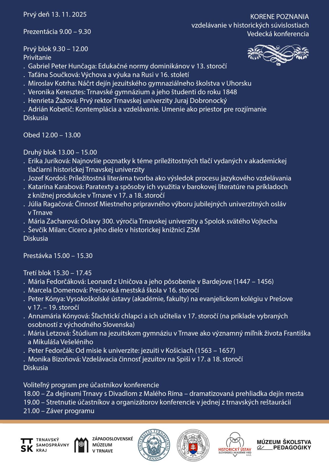 Západoslovenské múzeum v Trnave v spolupráci s Ústavom dejín Trnavskej univerzity v Trnave a za účasti spoluorganizátorov, ktorými sú Múzeum školstva a pedagogiky, Katedra histórie Filozofickej fakulty Trnavskej univerzity v Trnave, Spolok trnavských historikov SHS pri SAV – Tyrnavia pripravili vedeckú konferenciu s názvom KORENE POZNANIA – vzdelávanie v historických súvislostiach. Konferencia sa koná pri príležitosti 390. výročia založenia Trnavskej univerzity (1635 – 1777).