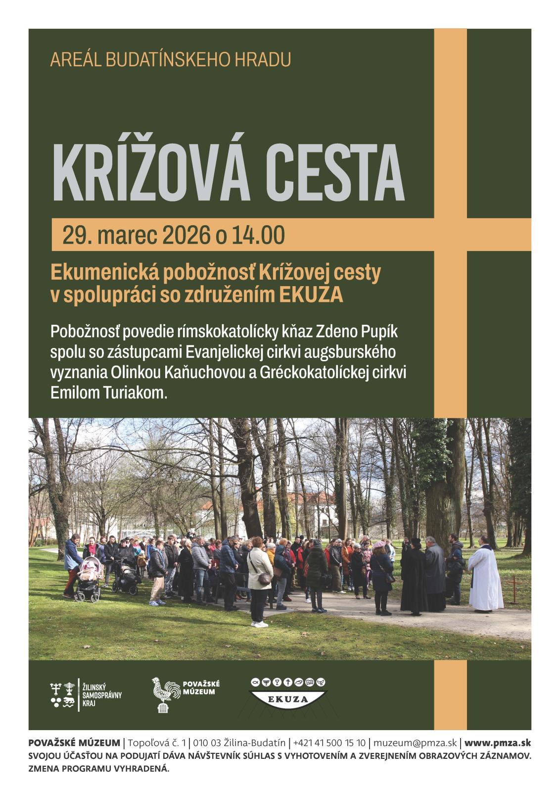 Na Kvetnú nedeľu sa v areáli Budatínskeho parku uskutoční ekumenická Krížová cesta. Pobožnosť povedie rímskokatolícky kňaz Zdeno Pupík spolu so zástupcami Evanjelickej cirkvi augsburského vyznania a Gréckokatolíckej cirkvi.