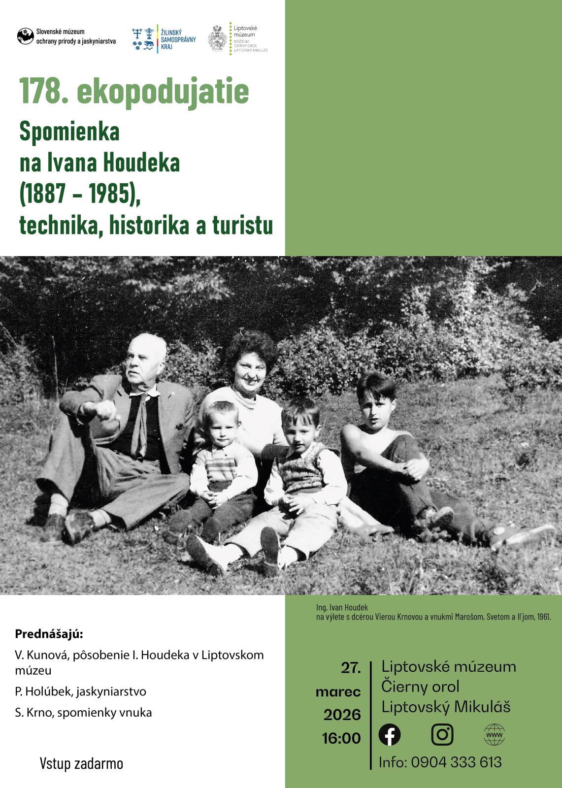Prednášajú: Mgr. Viera Kunová, kurátorka Liptovského múzea v Ružomberku, Ing. Peter Holúbek, riaditeľ a speleológ SMOPaJ a prof. PhDr. Svetozár Krno, CSc., vnuk Ivana Houdeka.