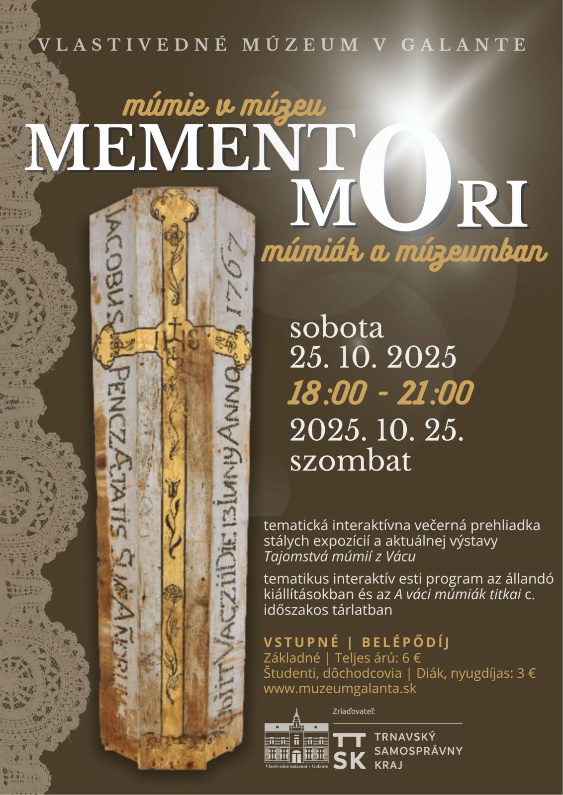 Podujatie Memento Mori – múmie v múzeu sa uskutoční 25. októbra 2025 (sobota) od 18:00 do 21:00 v hlavnej budove Vlastivedného múzea v Galante. Vstupné: dospelí 6 €, študenti a dôchodcovia 3 €.