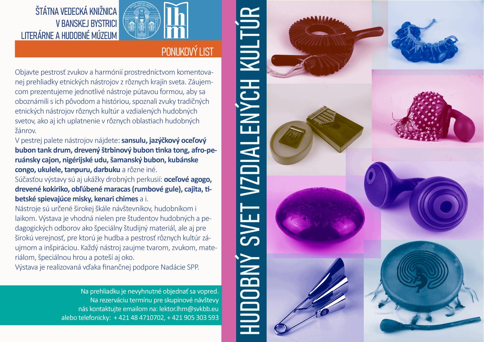 Objavte pestrosť zvukov a harmónií prostredníctvom komentovanej prehliadky etnických nástrojov z rôznych krajín sveta. Záujemcom prezentujeme jednotlivé nástroje pútavou formou, aby sa oboznámili s ich pôvodom a históriou, spoznali zvuky tradičných etnických nástrojov rôznych kultúr a vzdialených hudobných svetov, ako aj ich uplatnenie v rôznych oblastiach hudobných žánrov.
