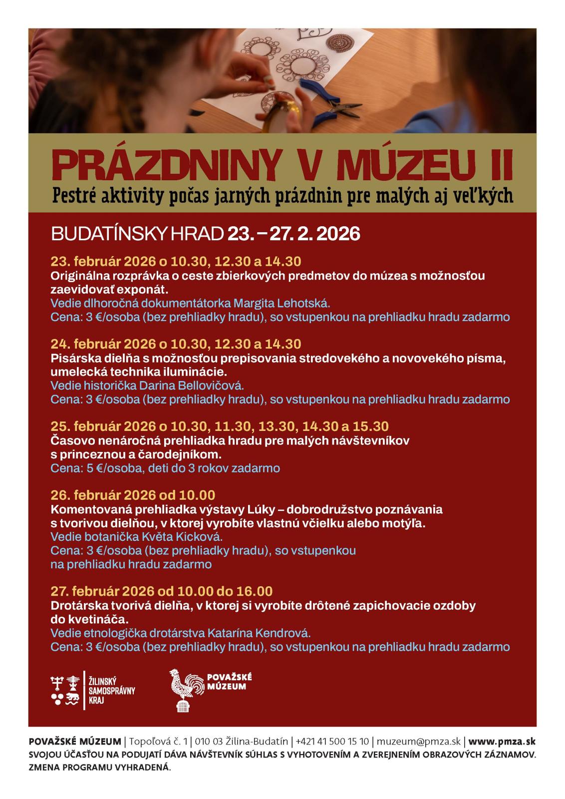 Cena tvorivej dielne: 3 €/osoba (bez prehliadky hradu), so vstupenkou na prehliadku hradu je tvorivá dielňa zadarmo