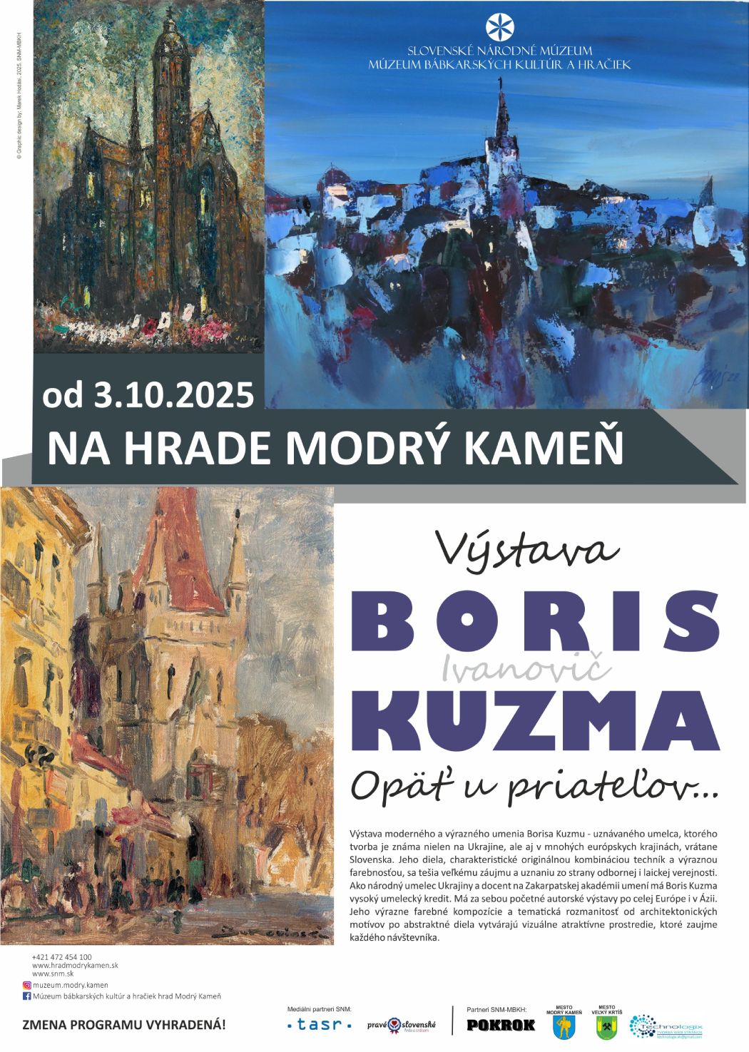 Reprezentatívna výstava renomovaného ukrajinského umelca Borisa Kuzmu prinesie na hrad výnimočné spojenie súčasného výtvarného umenia a historickej architektúry. Boris Kuzma, národný umelec Ukrajiny a docent na Zakarpatskej akadémii umení, je známy svojou originálnou kombináciou techník, výraznou farebnosťou a tematickou pestrosťou. Jeho diela sú súčasťou mnohých zbierok nielen na Ukrajine, ale aj v rôznych európskych krajinách vrátane Slovenska. Autor má za sebou desiatky úspešných autorských výstav naprieč Európou a Áziou.