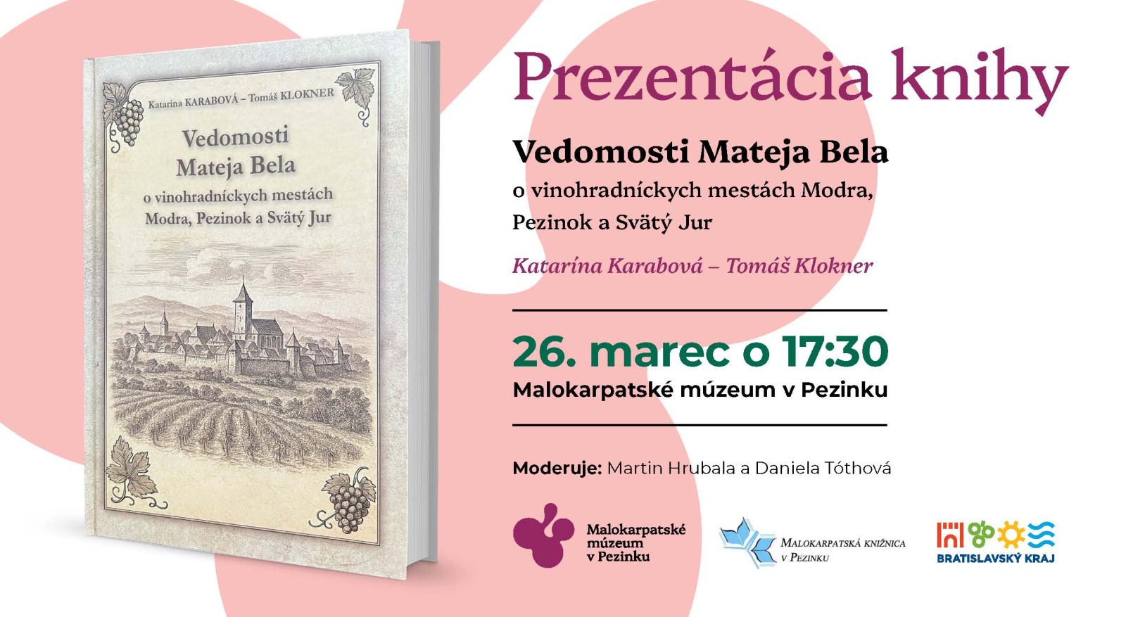 Srdečne vás pozývame na prezentáciu novej knihy Vedomosti Mateja Bela o vinohradníckych mestách Modra, Pezinok a Svätý Jur.