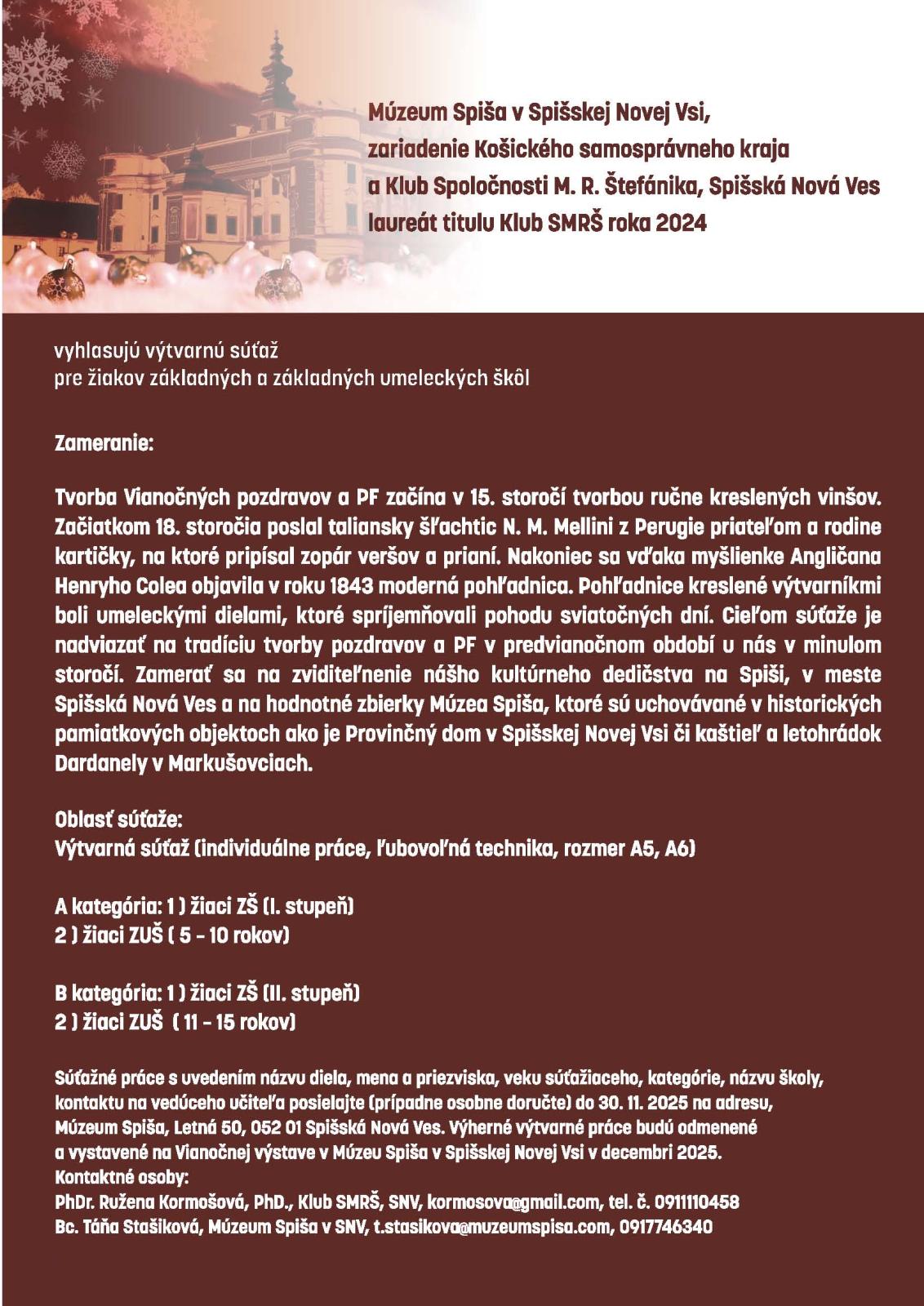 Súťažné práce s uvedením názvu diela, mena a priezviska, veku súťažiaceho, kategórie, názvu školy, kontaktu na vedúceho učiteľa posielajte (príp. osobne doručte) do 30. 11. 2025 na adresu: Múzeum Spiša, Letná 50, 052 01 Spišská Nová Ves. Výherné výtvarné práce budú odmenené a vystavené na Vianočnej výstave v Múzeu Spiša v Spišskej Novej Vsi v decembri 2025.