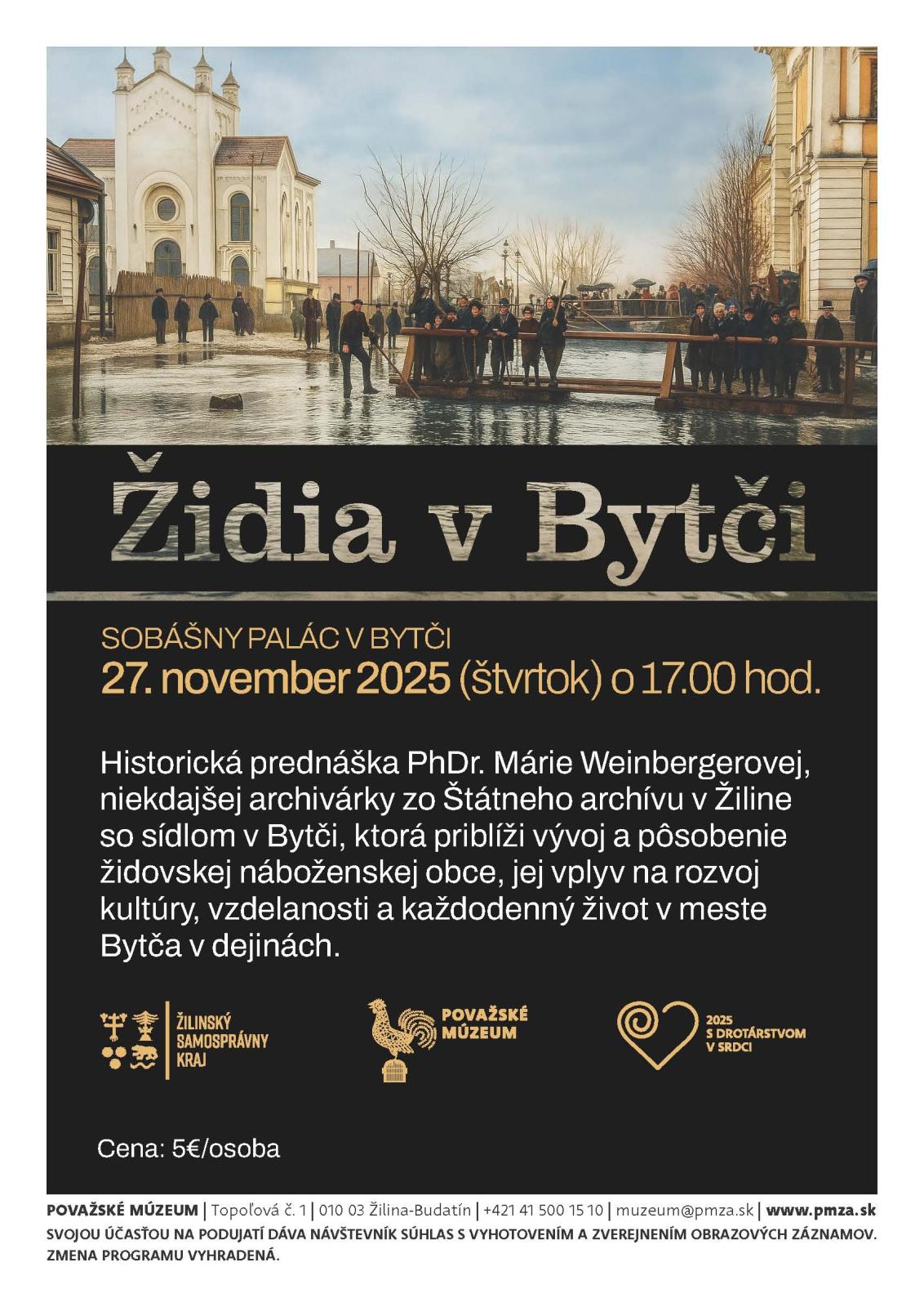 Historická prednáška PhDr. Márie Weinbergerovej, niekdajšej archivárky zo Štátneho archívu v Žiline so sídlom v Bytči, ktorá priblíži vývoj a pôsobenie židovskej náboženskej obce, jej vplyv na rozvoj kultúry, vzdelanosti a každodenný život v meste Bytča v dejinách.