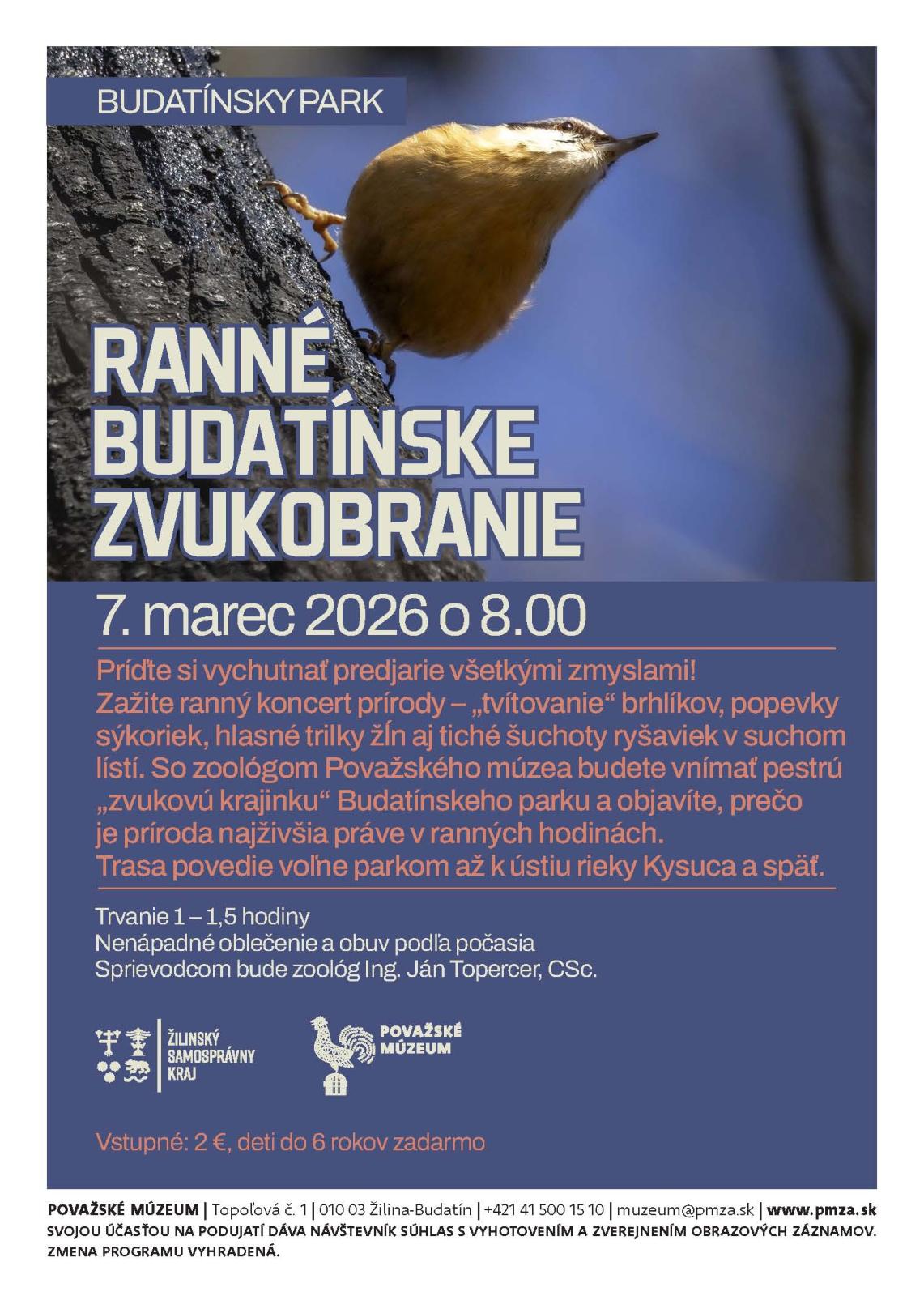 Z parku už pár týždňov počuť „tvítovanie“ brhlíkov, popevky sýkoriek, hlasné trilky žĺn a mnohé iné predjarné zvuky. Pripomínajú, že aj tento rok sa môžete tešiť na Ranné budatínske zvukobranie, kde sa o nich dozviete viac. Stretneme sa v sobotu 7. marca o 08.00 pri bráne Budatínskeho parku. Trasa povedie voľne parkom až k ústiu rieky Kysuca a späť. Nenáročný terén, pohyb po spevnených chodníkoch i mimo nich, trvanie asi 1 – 1,5 hodiny. Obuv a oblečenie podľa počasia, nie veľmi farebné (najlepšie zelená, hnedá alebo sivá farba). Sprievodcom bude zoológ Ing. Ján Topercer, CSc.